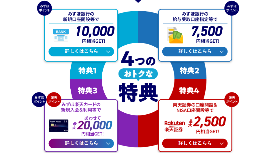 口座保有者が参加できるキャンペーン(④~⑥)が「みずほ楽天カード」関連と、カードに入会しないと受け取れない特典がいくつかあります。