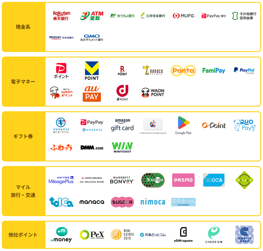 交換先も豊富で、現金・電子マネー・ギフト券・マイルなど自由自在