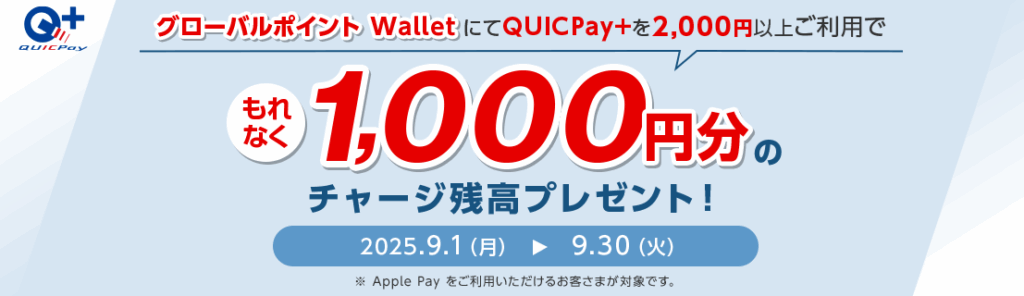 - 【iPhone限定/既存OK】グローバルポイントWalletでQUICPay払い|1,000円|9/1~9/30