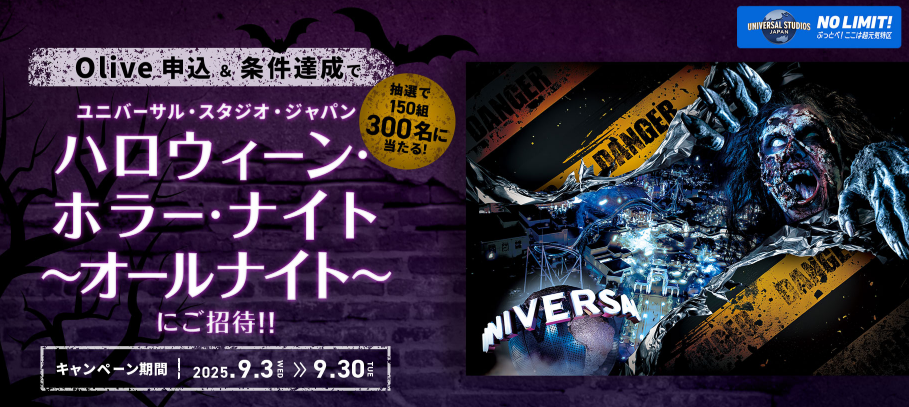 Oliveのアカウントを新規開設することで、ユニバーサルスタジオジャパンの「ハロウィン・ホラー・ナイト~オールナイト~」の招待チケットが当たります。