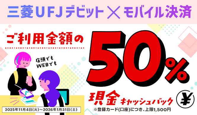 - 三菱UFJデビット モバイル決済|50%還元(上限1,500円)|202/11/4~2026/1/31