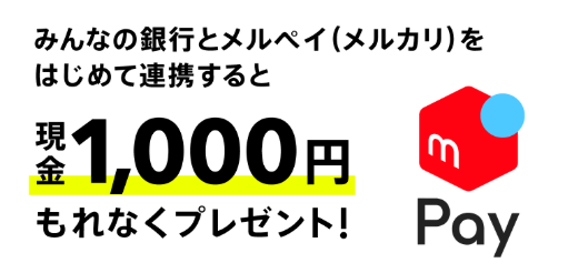 みんなの銀行とメルカリを初めて連携すると、現金1,000円がプレゼントされるキャンペーン!